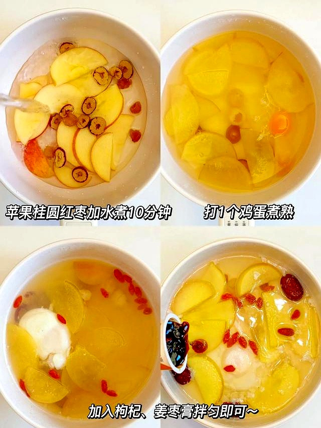 红糖温补,鸡蛋提供优质蛋白,苹果促进吸收,喝完浑身暖乎乎的,气色也会肉眼可见地变好。